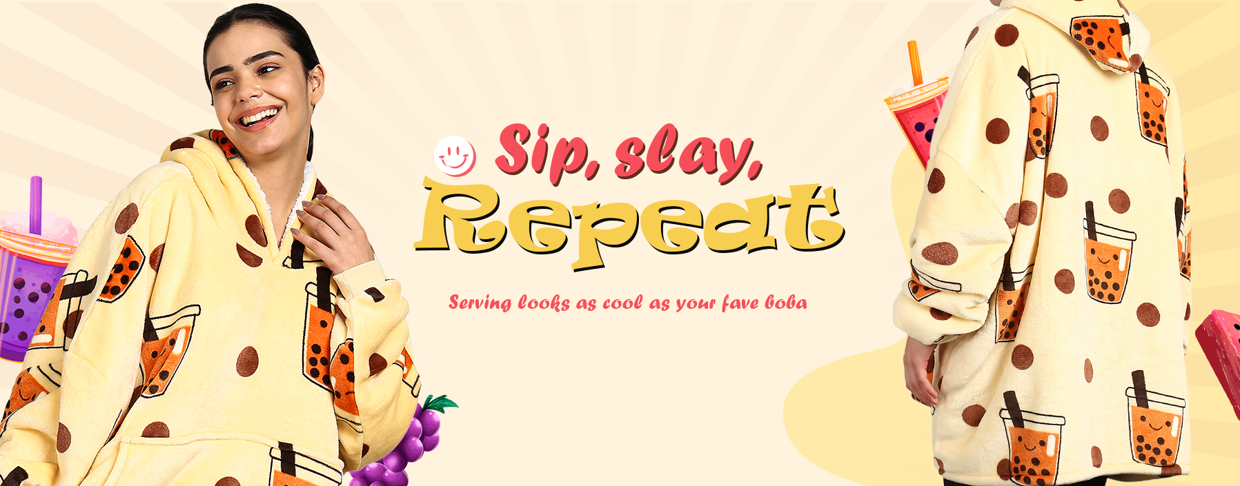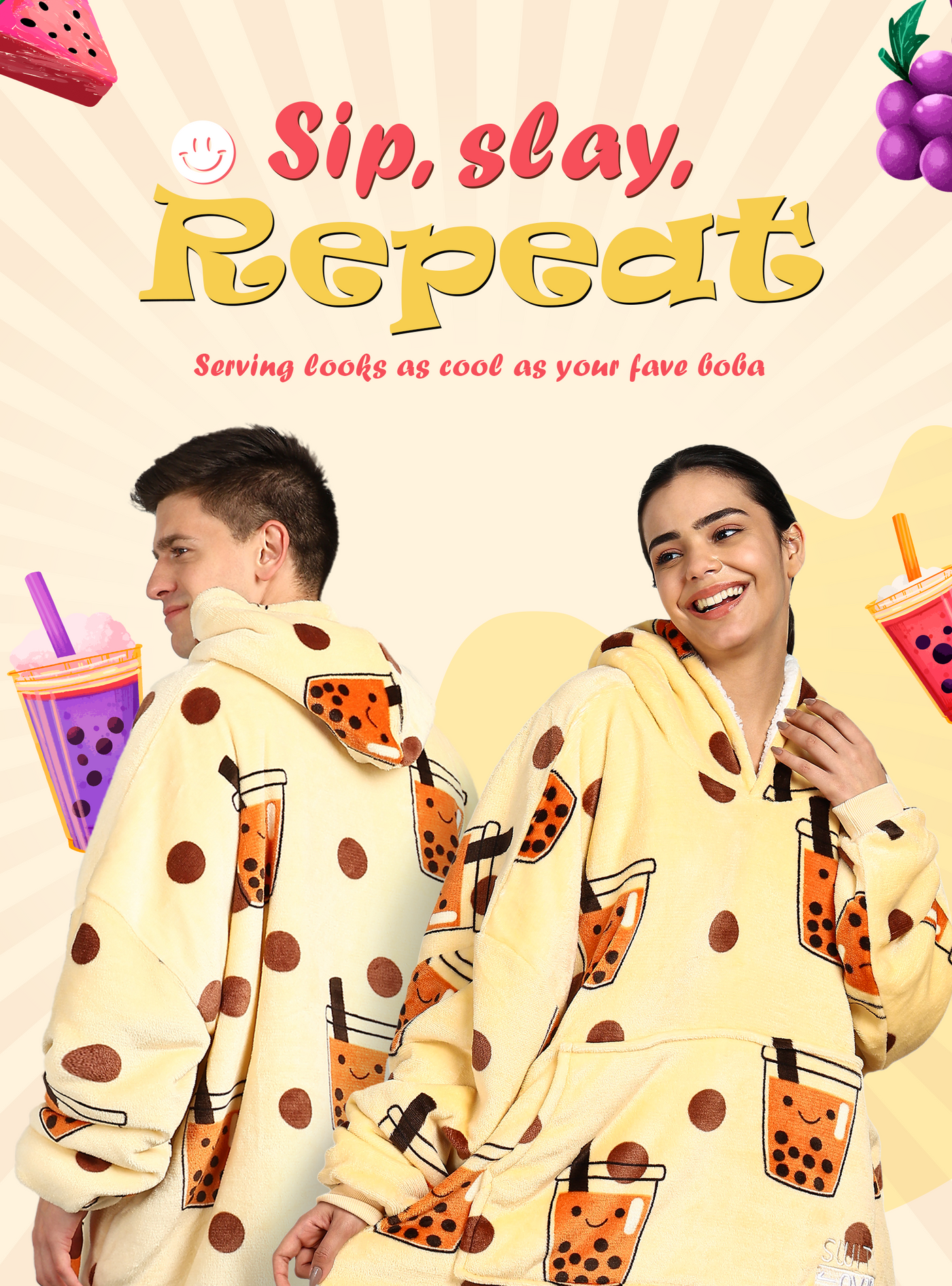 Boba Tea Printed Wearable Sherpa Unisex Blanket Hoodie