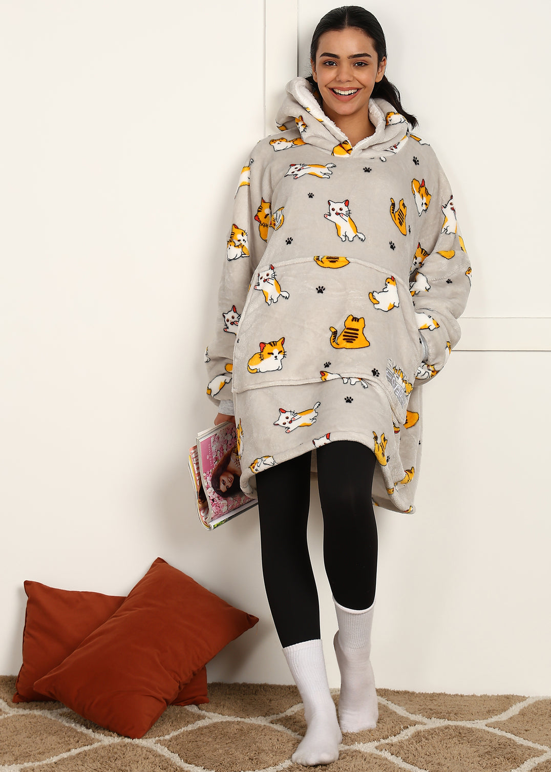 Cozy Cat Printed Wearable Sherpa Unisex Blanket Hoodie